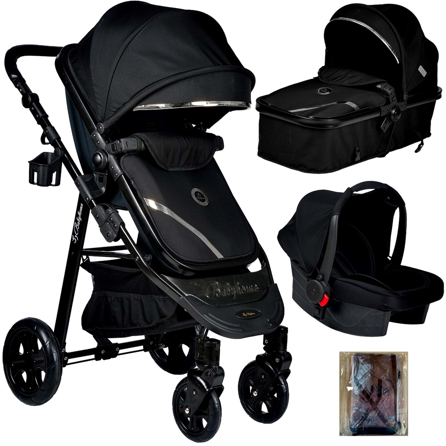 Bebek arabası ile ana kucağını birlikte travel set olarak kullanmaya yarayan adaptörler, kapalı paket içerisinde bulunmaktadır.