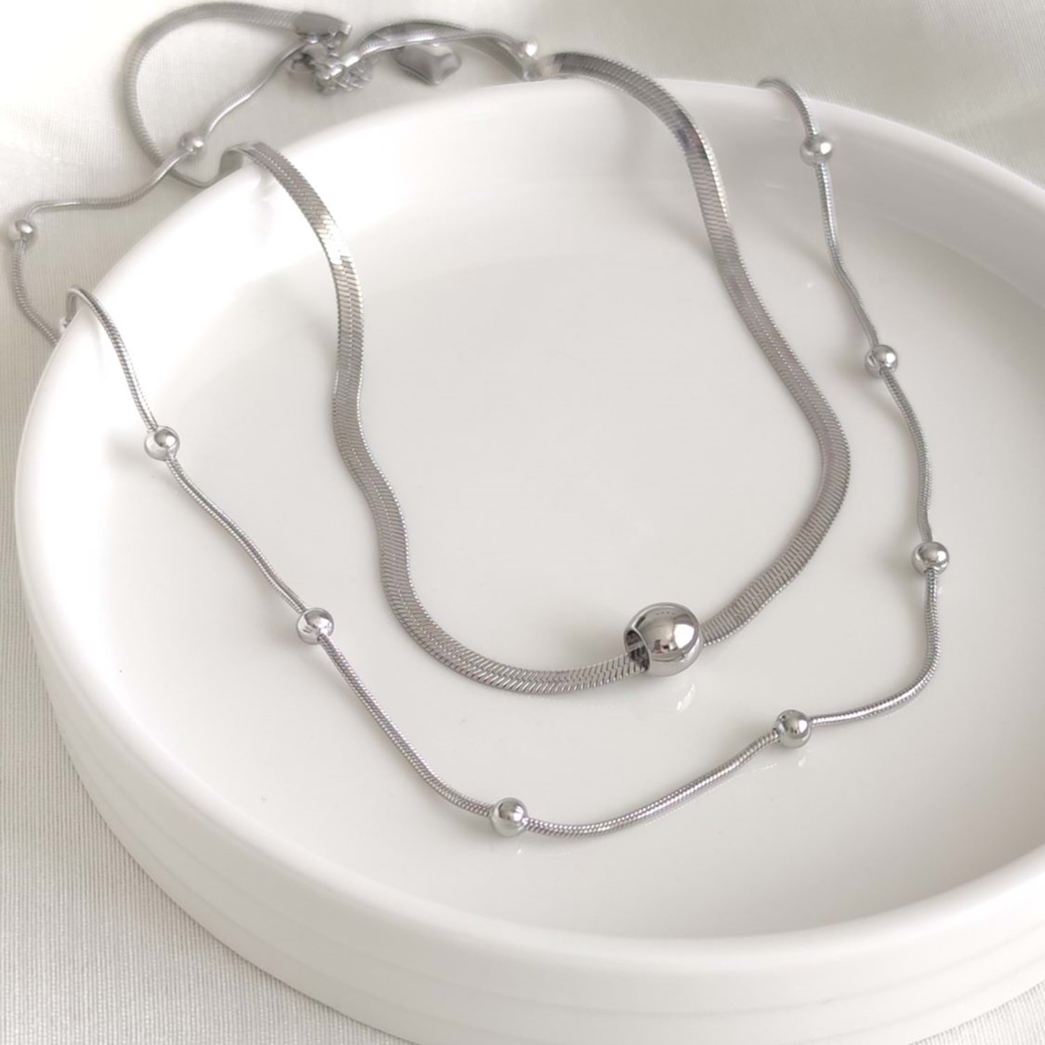 ÇELİK YASSI VE TOP ZİNCİR KOMBİN İKİLİ KOLYE - BEYAZ