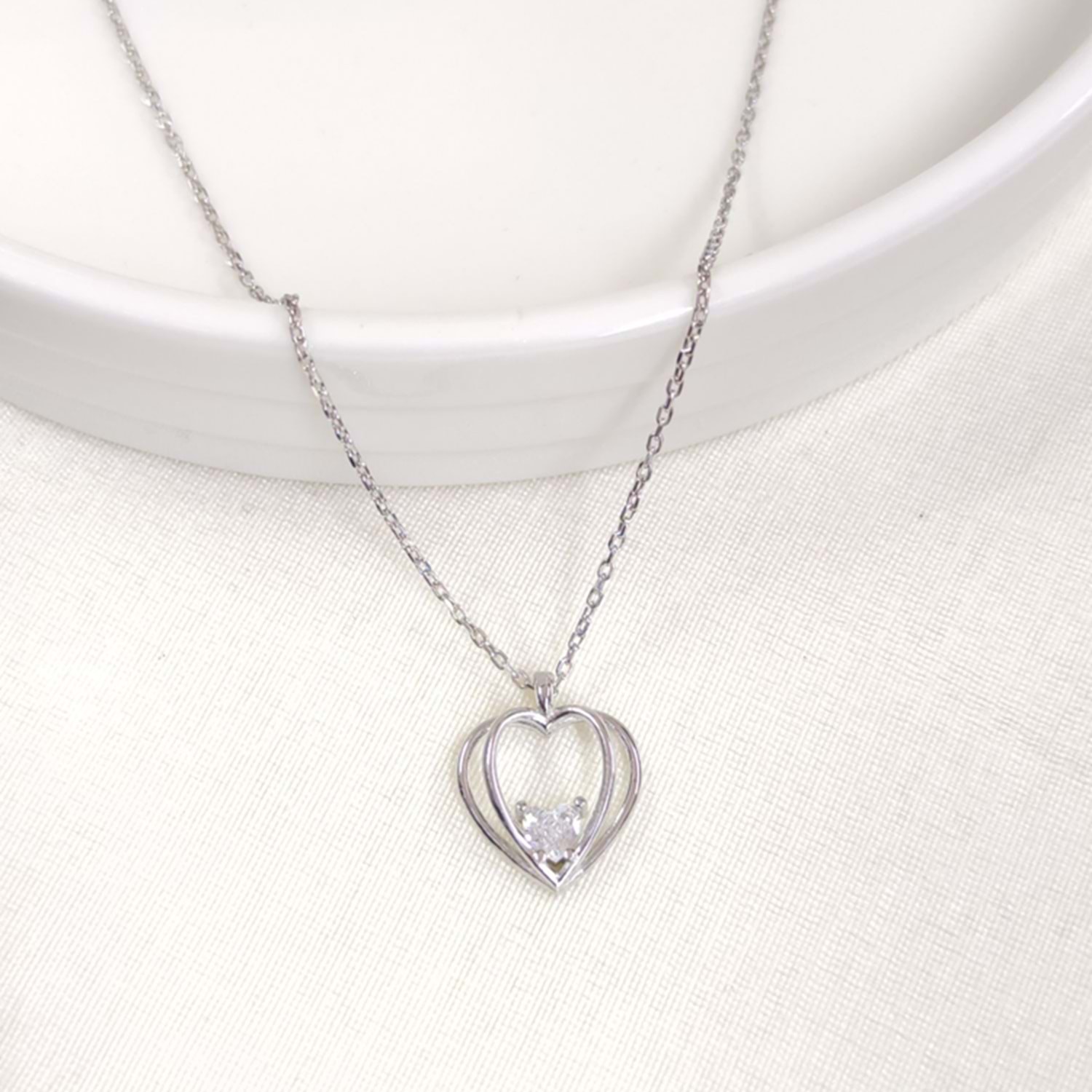 12 MM ZİRKON TAŞLI KALP GÜMÜŞ KOLYE 40+5 CM - RODYUM BEYAZ