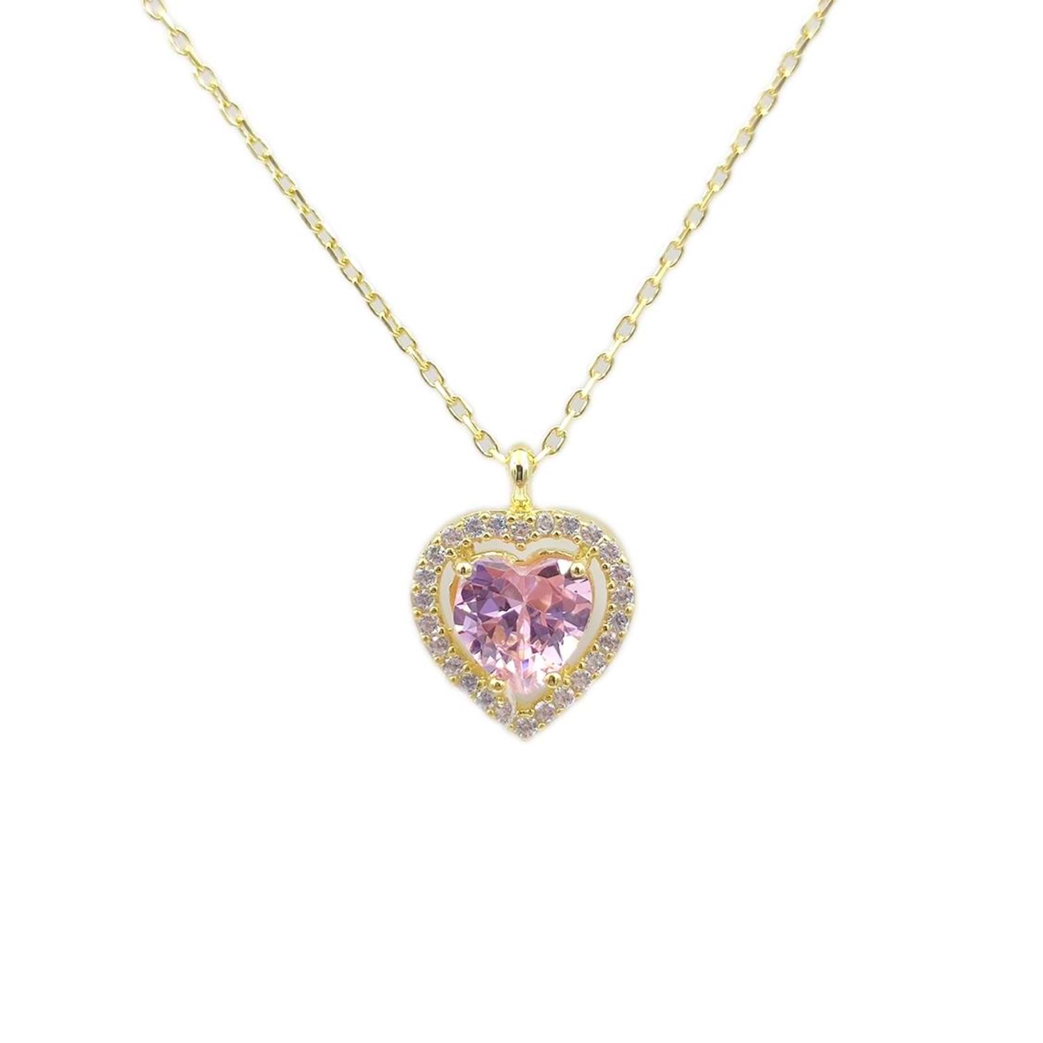 PEMBE TAŞLI KALP GÜMÜŞ KOLYE - ALTIN SARI