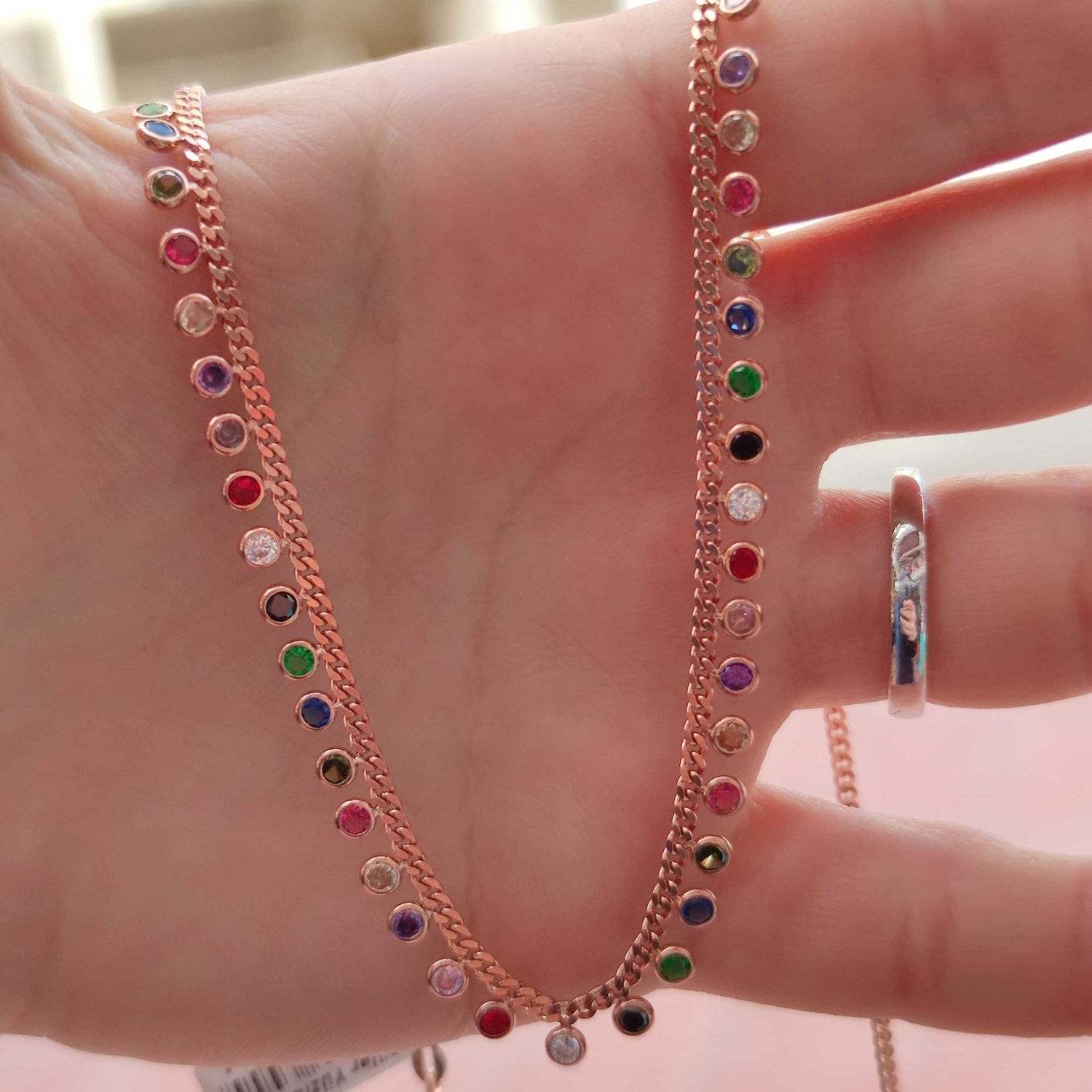 RENKLİ MİX TAŞLI SIRALI SALLANTILI GÜMÜŞ KOLYE
